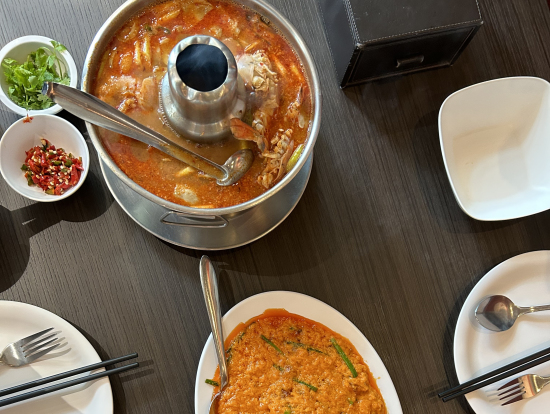 お昼のメニューが、トムヤムクン・プーパッポンカレー・空芯菜炒めと豪華でおいしかったです!!
