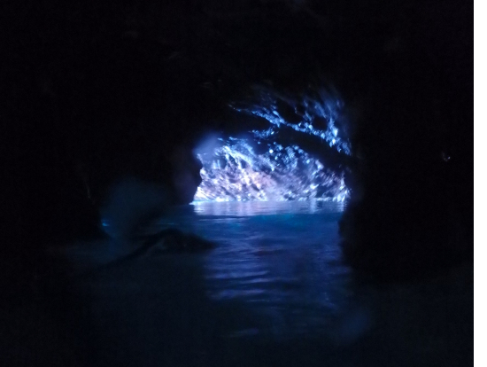 青の洞窟は晴れていましたが中は暗く水面はそこまで青くなかったです。水中は青でした。