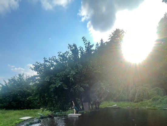翌日は7時に起きて、おじじと朝の散歩です。キャンプ場も併設されている場所で谷川岳から流れてくる川に足をつけるなどしましたが、残暑厳しい中でも水がとても冷たく、眠気が一気に吹き飛びました。