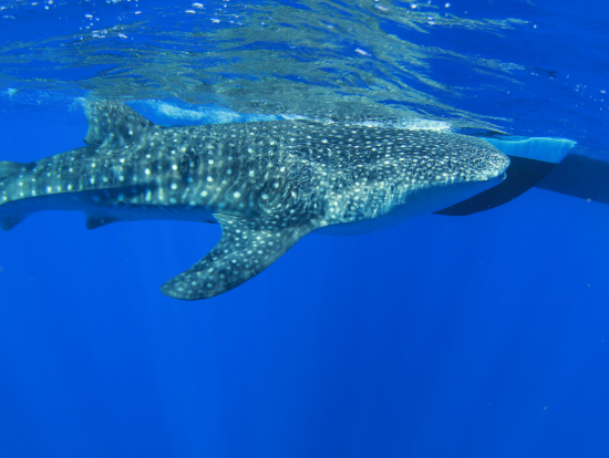イルカと泳ぐチャンスは3回訪れたものの、海の中では全く見つけることができず、今までに見たことのない透きとおった青い海と船の上から見れた可愛いイルカの姿だけでもまあ満足かなとやや諦めかけたその時、なんとジンベイザメが出現!!海に入るとすぐ近くにジンベイザメを見ることができました。少し追いかけると下の方に泳いで行ってしまったので船に戻りましたが、まさかのジンベイザメとの出会いに感動(*≧∀≦*)