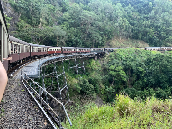 キュランダ鉄道は、レトロな列車で熱帯雨林を駆け抜け、世界の車窓からのような風景です。