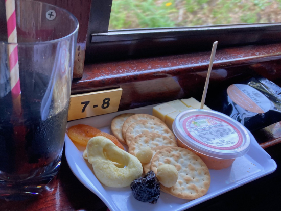 列車内では、アルコールを含む飲み物は全て無料。チーズやクラッカー、ドライフルーツにマカデミアナッツ、シャーベットまで次々と頂き、お土産のポストカードやペンまで付いて、ゴールドクラスの追加料金分は充分ペイした感じでした。