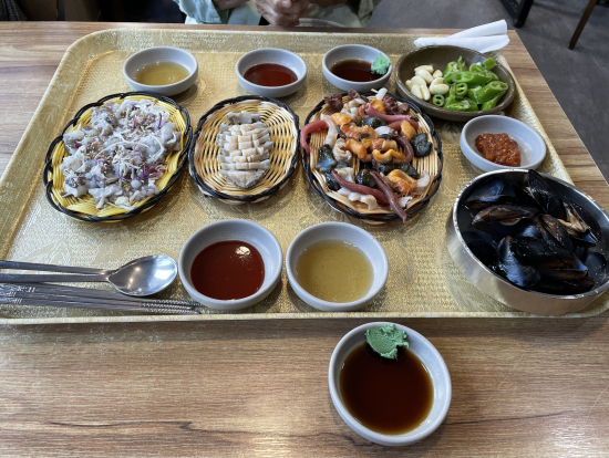 それと、ガイドの李さん(名前間違えてたらごめんなさい)にお勧めされた、貝のお刺身とタコの踊り食いサンナッチがセットになっている物を個人的に頼んだのですが、これがまた新鮮でとても美味しかったです!