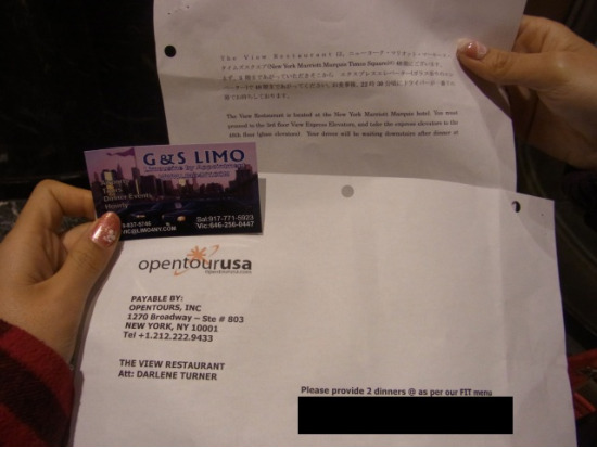マリオットホテルへ到着すると、レストランへの行き方の紙、レストラン側へ渡す予約証明書、ドライバーさんの名刺が渡されます。少し早めに帰りたい方は、ドライバーに電話すれば早く迎えにきてくれるそうです。英語ができない人でも、レストラン受付の人に紙を見せるだけでスムーズにテーブルまで案内してくれますので、ご安心を!